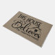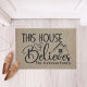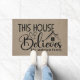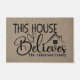 This doormat features the Christian proclamation "This House Believes" on a tan burlap background, details include a house rooftop and Christian cross with heart details. Add your family name or custom text to make this doormat uniquely yours. Order today for yourself or to give as a special gift.