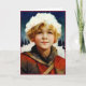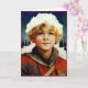 The Christmas card features a young blonde boy, about 12 years old, wearing winter clothes of red, brown, and white. He is standing in a snowy forest in the evening. The front of the card has the portrait of the young boy in the evening forest. The boy has a bright pleasant face and has the look of someone who is good in his heart and curious about life.