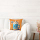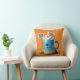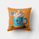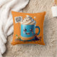 The pillow showcases an adorable blue coffee mug character with happy eyes and a wide smile. The mug is topped with a swirl of whipped cream sprinkled with coffee beans, adding a delightful detail. The character holds a sign that reads, "STAND BACK, ORANGE JUICE. THIS IS A JOB FOR COFFEE!"—a humourous declaration of coffee’s superiority. The design includes scattered coffee beans and an orange, symbolising the playful rivalry between coffee and orange juice. A ribbon tied around the mug adds an extra layer of charm.