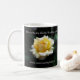 An 11 oz. mug set with a photo of a yellow rose with a darkened green-leaf background. Inspirational