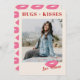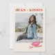 Perfect for a boyfriend, husband, or lover, this flirty Polaroid-inspired Valentine's Day card features a large photo with a hand-drawn kiss illustration overlay. The "Hugs + Kisses" greeting is prominently placed at the top of the card in a bold serif font, while a modern cursive font is used for the customer's name below. A coordinating kiss pattern is featured on the back side of the card.