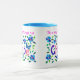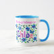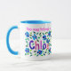 A white ringer mug with a powder blue rim and handle, decorated with a floral handpainted paper collage and the words 'This Mug Belongs to Chloe'. Dishwasher and microwave safe.