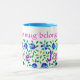 A white ringer mug with a powder blue rim and handle, decorated with a floral handpainted paper collage and the words 'This Mug Belongs to Jane'. Dishwasher and microwave safe.