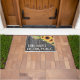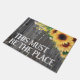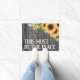 This Must Be The Place sunflower doormat rug with a dark wood pattern background. Welcome home sweet home.