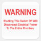 A sheet of six 3" x 3" stickers for electricians. Each sticker reads: "WARNING Shutting This Switch Off Will Disconnect Electrical Power To The Entire Premises." Red letters on a white background.