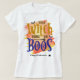 The colourful text on this Halloween shirt says "This Witch Runs On Boos" against an abstract orange and gold background. A few bats flit about, and a broom separates the text. At the bottom a little black spider hangs from its web, and the custom text says "Happy Halloween".