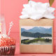 Rectangular souvenir photo sticker with the church of St. Thomas (Sveti Tomaž) on a hill surrounded by morning fog in the countryside of Slovenia near Skofja Loka during a pink sunrise with Alps mountains in the background.