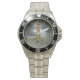 Has heft and feel of expensive stainless steel quartz watches. Good band with safety catch. I removed links, which is easy because engraved arrows show direction to push the linking pins. As always by this seller, the image (a railroad logo) is a perfect reproduction of my emailed image, and is precisely spaced and aligned.
