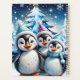 Three adorable penguins stand in festive winter hats and colourful scarves. Their big, round eyes shine with joy, while their fluffy white bellies contrast with the bright blue Christmas tree decorated with twinkling lights. The penguins smile happily and seem ready to celebrate the magic of the holiday season. All around them, delicate snowflakes dance through the air, while twinkling stars shine in the sky, creating a warm, festive atmosphere. This design perfectly captures the spirit of Christmas - full of joy, friendship and winter wonder!