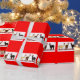 Three alpacas in Santa hats decorate this Christmas wrapping paper which reads "Christmas Greetings"