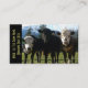 A trio of big brute steers of various breeds and colour combinations stand together on a field in the country with mountains, blue sky, and tall evergreen trees in the background. Customise both sides with your contact information to advertise your cattle farming ranch, abbatoire or custom cutting and wrapping butcher services.