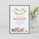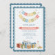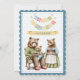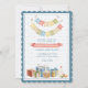 This sweet first birthday invitation features a "happy birthday" banner in primary colours on the top and coordinating presents on the bottom. Around the edge is a blue scalloped border. The back has scene with three bears, a mum bear holding a cake, and a dad bear holding a toddler bear in a chair. You can personalise with all the details for your special event.