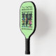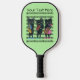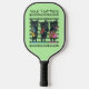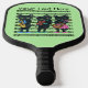 This pickle ball paddle is green with three black cats playing music instruments dressed in blue, green and pink standing on sheet of musical notes. Customise your text on front and back with the template.