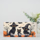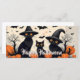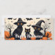 Three black cats with glowing orange eyes sit among pumpkins. Two wear witch hats as bats fly across the sky. A playful yet mystical Halloween scene that blends charm, magic, and a touch of gothic allure.
