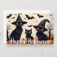 Three black cats with glowing orange eyes sit among pumpkins. Two wear witch hats as bats fly across the sky. A playful yet mystical Halloween scene that blends charm, magic, and a touch of gothic allure.