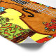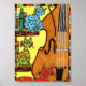 Decorate your walls in style with this unique, colourful folk art mini poster. In this cute, whimsical artwork, these three colourful cats are sitting on the floor and bookshelves around a bass fiddle, which occupies an entire corner of the room due to its large size. The entire scene is surrounded by a multicolored matching border. This mini poster would make a great gift for musicians, music teachers or music lovers who also love cats.