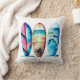 This watercolor painting features three surfboards with unique designs. The first surfboard has a sunset painted on it, the second surfboard has a palm tree, and the third surfboard has a wave. The surfboards rest against a backdrop of turquoise water, creating a peaceful and summery scene.
