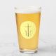 Beer or drinking glass featuring three reddish-brown crosses, like those on Calvary, make a simple statement. They show in a pale yellow, fractal circle. Great gift for anyone of Christian faith. Makes a thoughtful Christian housewarming gift.