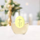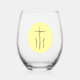 Stemless wine glass showing three reddish-brown crosses, like those on Calvary, make a simple statement. They show in a pale yellow, fractal circle. Great Christian housewarming gift. Lovely way to share your faith.