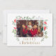 Three custom photo Christmas greeting cards. Elegant green botanical leaves, red flower frame with white background, and MERRY CHRISTMAS elegant gold typography.