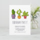 A birthday party invitation with a whimsical illustration featuring 3 happy little cacti sitting in their own flower pots. They each have their own unique expressions looking happy and joyful.
