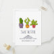 Save the date fun party invitation postcard with a whimsical illustration featuring 3 happy little cacti sitting in their own flower pots. They each have their own unique expressions smiling and looking happy.