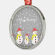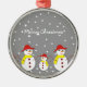 Three cute snowmen custom Christmas ornament featuring three adorable snowmen with red hat, yellow scarf, button eyes and sticks on a grey background with snowflakes.