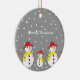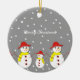 Three cute snowmen custom Christmas ornament featuring three adorable snowmen with red hat, yellow scarf, button eyes and sticks on a grey background with snowflakes.
