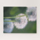 Enjoy putting the pieces of the "Waiting for the Breeze" painting puzzle together, three white dandelion blooms ready for a gentle breeze to release their wishes to the air with a green grass background.
