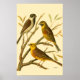 Artist W. Rutledge captured perfectly the vivid colours of those domestic birds. Get this simple yet beautifully realistic painting. Side view of two yellow birds and one darker bird on a branch and looking in different directions.