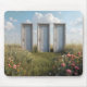 Three wooden doors stand upright in a grassy field surrounded by wildflowers, under a sky dotted with fluffy clouds