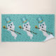 This custom beach towel is bright blue green covered in tiny black stars with three white fancy ghosts wearing top hats and holding ornate black canes topped with gold skulls.