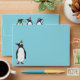 Destei's original illustration of three festive Gentoo penguins holding colourful Christmas lights with their beaks. One penguin is wearing a green scarf, another one is wearing purple ear protection and the third penguin in the middle is wearing a red and white Santa hat. The background colour is light blue.