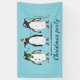 Destei's original illustration of three festive Gentoo penguins holding colourful Christmas lights with their beaks. One penguin is wearing a green scarf, another one is wearing purple ear protection and the third penguin in the middle is wearing a red and white Santa hat. The background colour is light blue. There are also two personalizable text areas.