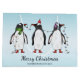 Destei's original illustration of three adorable festive Gentoo penguins holding colourful Christmas lights with their beaks. One penguin is wearing a green scarf, another one is wearing purple ear protection and the third penguin in the middle is wearing a red and white Santa hat. The background is a light blue gradient. There are also two personalizable text areas.