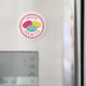 A magnet featuring an illustration of three French macarons (pink, blue, and yellow) inside a decorative pink and blue circle with pink text.