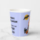 The feature on these fun kids' halloween paper cups is an image of three funny gnomes dressed in their Halloween clothing, each with different hats. Beside them are a jack o' lantern, a black cat, a full yellow moon with a flying bat, and a tree. Your custom text is in black typography at one side; make it say whatever you'd like!