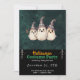 At the centre of the dark green background are three adorable ghosts wearing grey witch's hats. These whimsical ghosts add a sense of fun and whimsy to the invitation, making it perfect for a Halloween costume party.