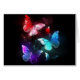 Three luminous, red, purple, green, textured, night butterflies on black luminous background.