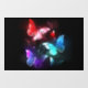 Three luminous, red, purple, green, textured, night butterflies on black luminous background.