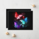 Three luminous, red, purple, green, textured, night butterflies on black luminous background.