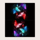 Three luminous, red, purple, green, textured, night butterflies on black luminous background.