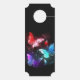 Three luminous, red, purple, green, textured, night butterflies on black luminous background.
