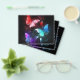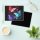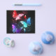 Three luminous, red, purple, green, textured, night butterflies on black luminous background.