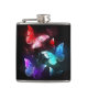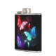 Three luminous, red, purple, green, textured, night butterflies on black luminous background.