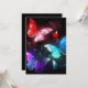 Three luminous, red, purple, green, textured, night butterflies on black luminous background.