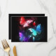 Three luminous, red, purple, green, textured, night butterflies on black luminous background.