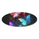 Three luminous, red, purple, green, textured, night butterflies on black luminous background.