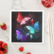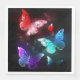 Three luminous, red, purple, green, textured, night butterflies on black luminous background.