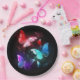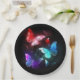 Three luminous, red, purple, green, textured, night butterflies on black luminous background.
